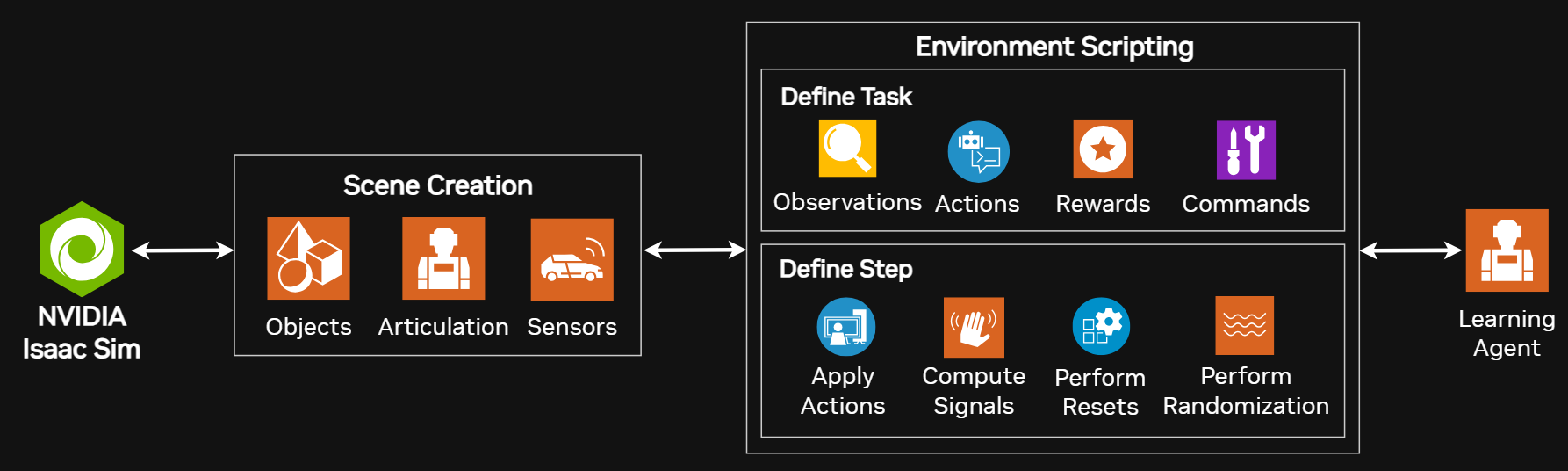 Isaac Lab is a framework developed by NVIDIA for robot learning that integrates with Isaac Sim for photo-realistic simulations. The core idea is to develop "environments" using the Isaac Lab API. These environments define a task for a robot to learn, such as a quadruped learning how to walk forward. Then, when writing a script that defines a neural network architecture and a training function, this environment is passed in as a parameter when this training script is ran.